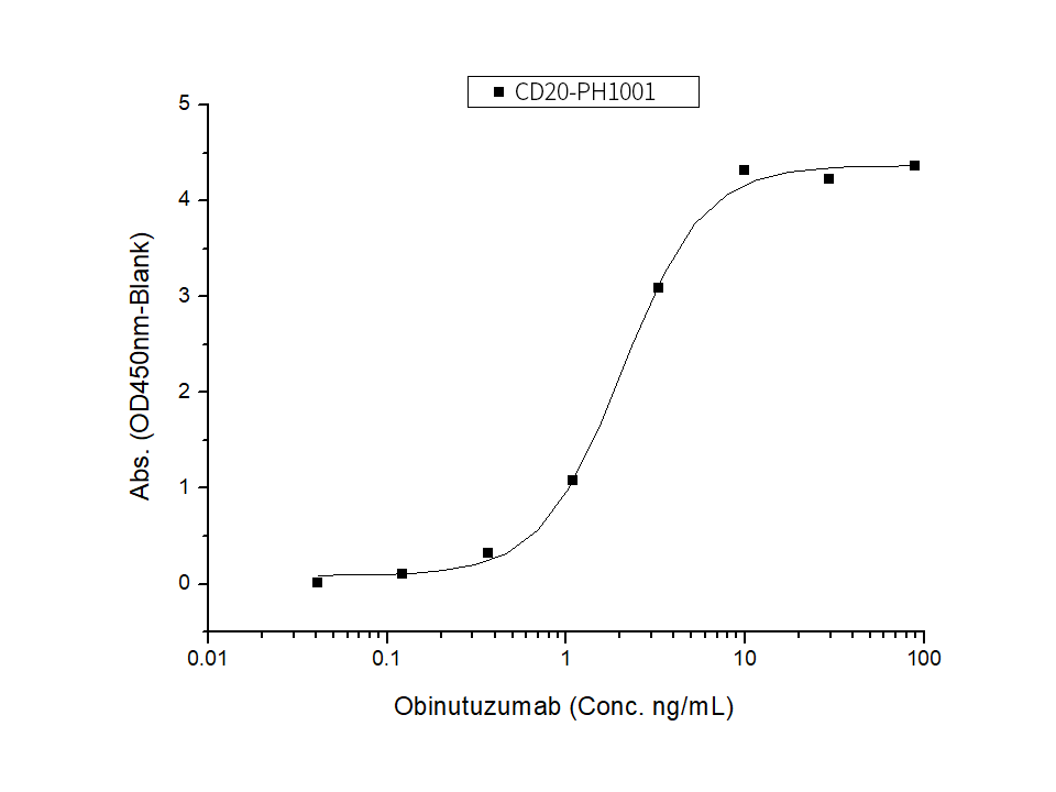 Immobilized Recombinant Human CD20 (Full Length) Protein-VLP (Cat: 11007-HNAH) at 5 μg/mL (100 μL/well) can bind Obinutuzumab, the EC50 is 1.0-3.0 ng/mL.(Routinely tested) |