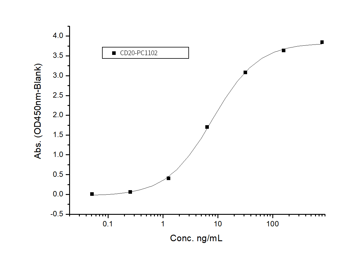 Immobilized Recombinant Cynomolgus CD20 Protein (VLP, Full-Length, His Tag)(Cat: 90052-C08H1) at 5 μg/mL (100 μL/well) can bind Rituximab derived Anti-CD20 antibody, Human IgG1, the EC50 is 20-60 ng/mL (Routinely tested). |