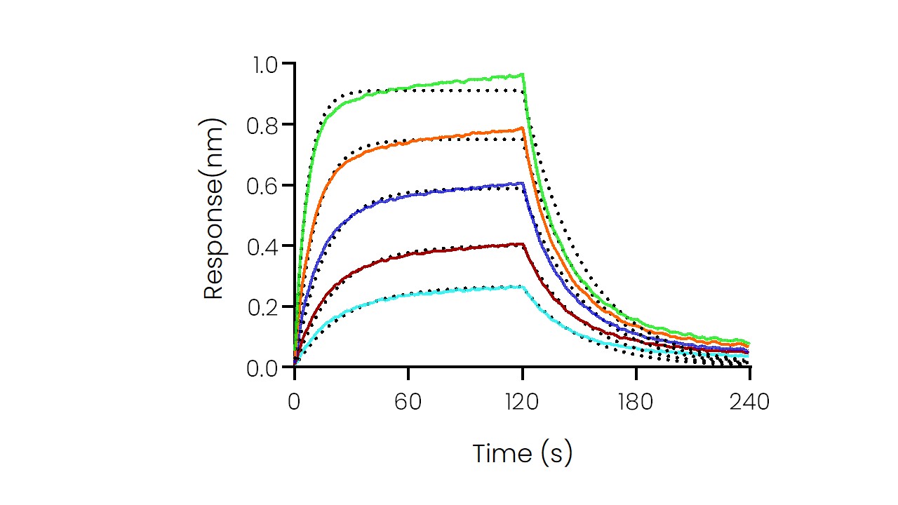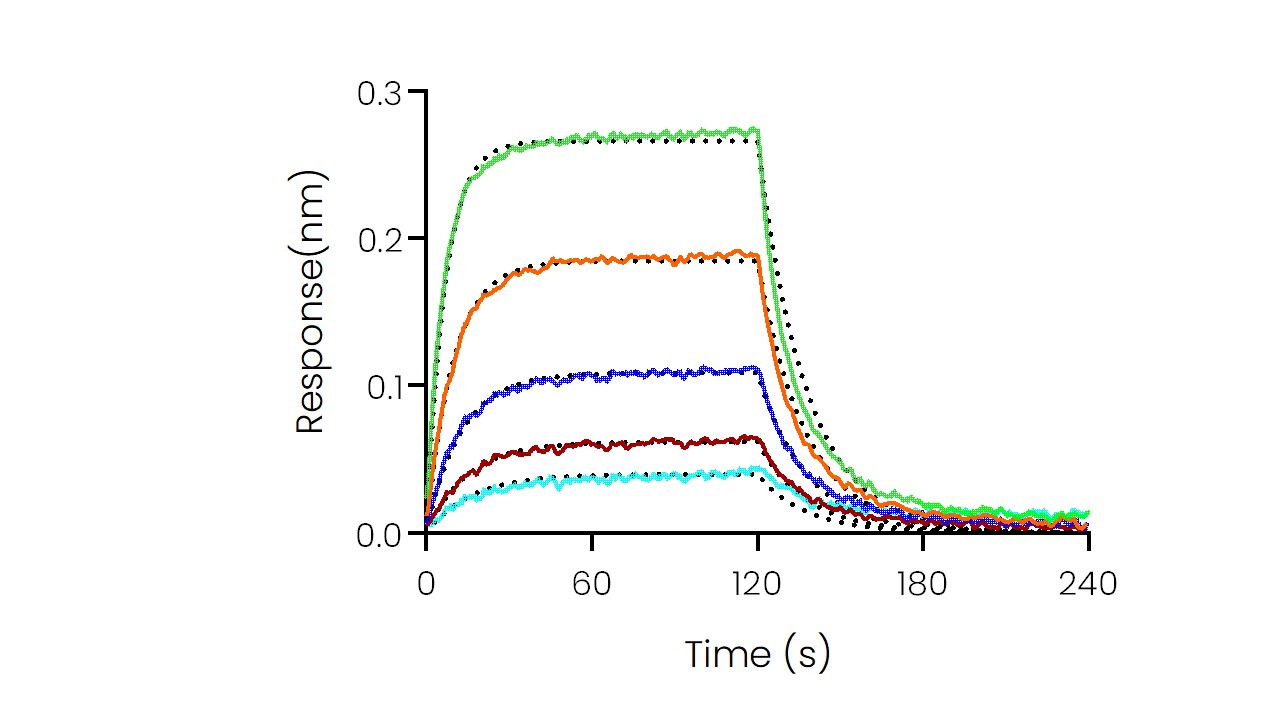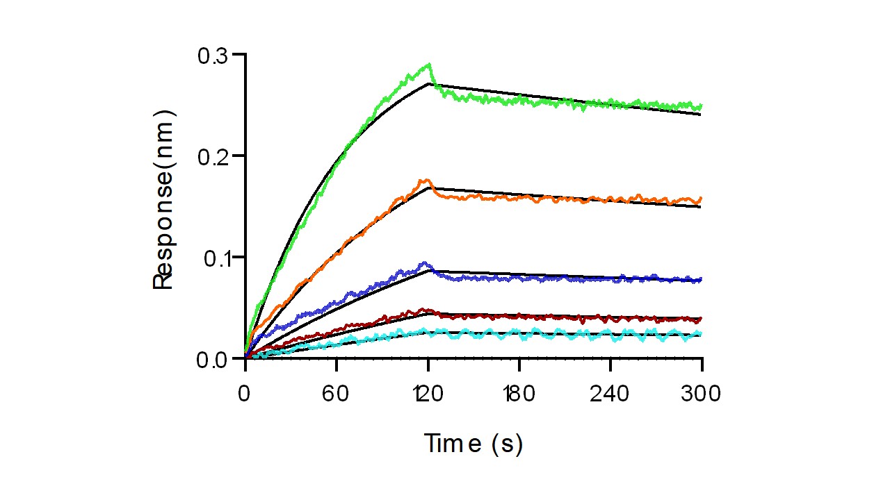 Loaded Recombinant Rhesus IL-2R beta/CD122 Protein, His & AVI Tag, Biotinylated (Cat. No. 90328-K49H-B) on SA Biosensor, can bind Recombinant Human IL-2 Protein, no Tag (Cat. No. 11848-HNAE2) with an affinity constant of 0.508 μM as determined in BLI assay (Sartorius Octet RED384) (Routinely tested). |