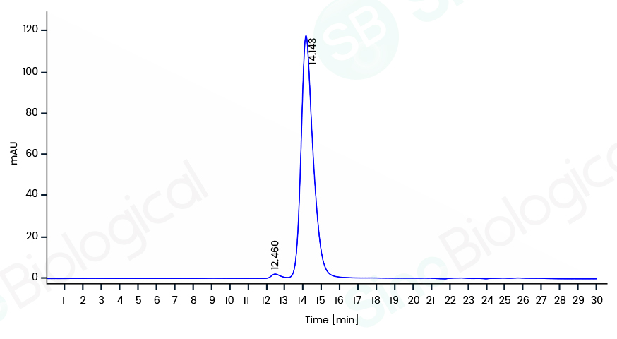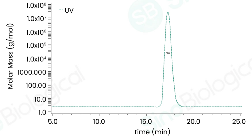 The purity of Recombinant Human IL2Ra / CD25 Protein,His Tag,HPLC-verified(Cat. No. 10165-H08H-UE)was more than 95% and the molecular weight of this protein is around 32.4 kDa verified by SEC-MALS(Routinely tested). |