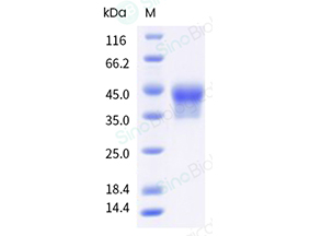 The purity of Recombinant Human IL2Ra / CD25 Protein,His Tag,HPLC-verified(Cat. No. 10165-H08H-UE)was more than 95% and the molecular weight of this protein is around 32.4 kDa verified by SEC-MALS(Routinely tested). |